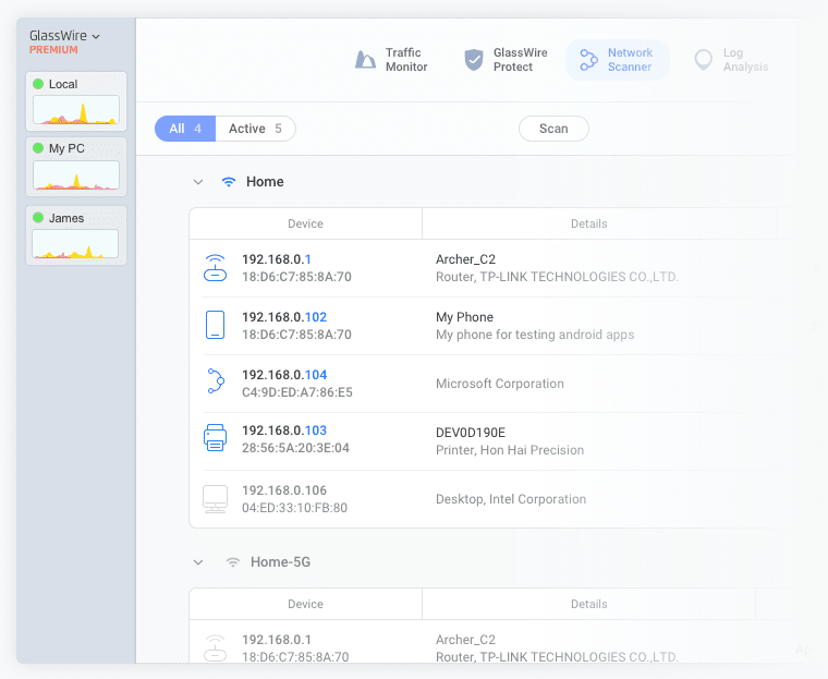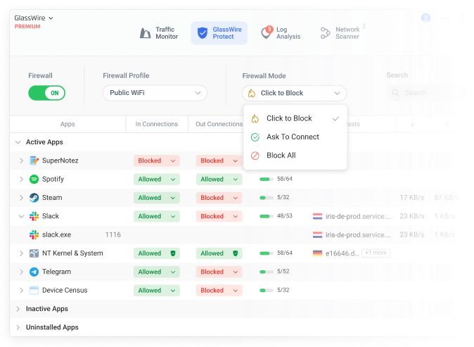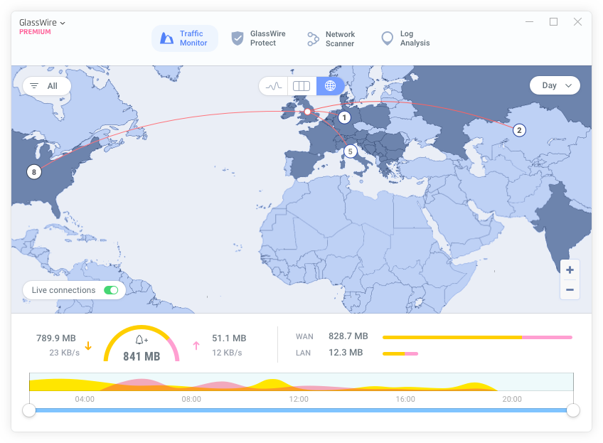 Say goodbye to bandwidth woes with our Bandwidth Usage Monitor. Our user-friendly tool provides complete visibility of your overall data consumption since GlassWire was first installed. You can quickly and easily see a detailed breakdown by Apps, Hosts and Traffic Type, making it simple to pinpoint exactly where your data is going. And if you're wondering why you're using more data than expected, simply head over to the Usage tab and discover which app or service is responsible. You can also independently analyze the bandwidth usage by exporting the data. With GlassWire, keeping track of your bandwidth usage has never been easier.